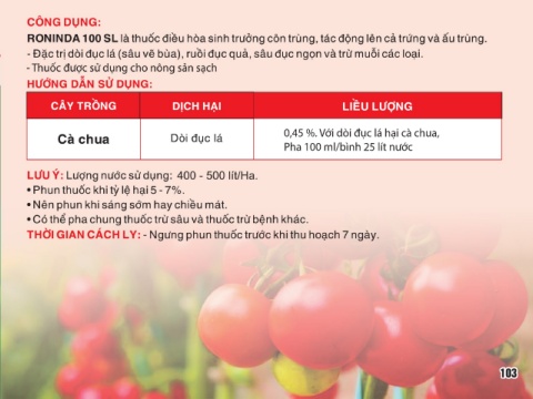 0,45 %. Với dòi đục lá hại cà chua, Pha 100 ml/bình 25 lít nước 103 103