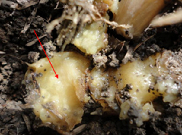 Hiện tượng thối củ là do nấm Rhizoctonia solani gây ra. Đầu tiên bệnh xuất hiện ở bẹ lá gần mặt đất, là những đốm màu nâu xám, từ 3-5mm. Sau đó vết bệnh lan rộng ra, không có hình thù nhất định, xung quanh viền nâu đậm hoặc nâu đen.