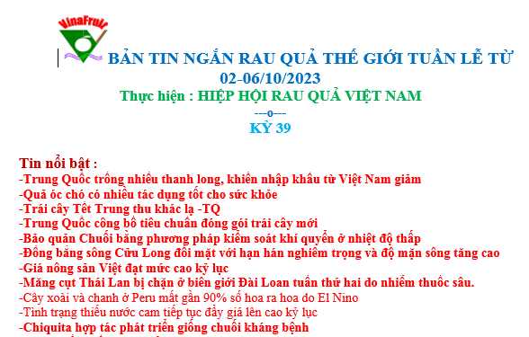 Giá cherry tại Việt Nam tăng 35% trước Tết do nhu cầu nhập khẩu cao cấp tăng cao -Philippines tìm cách giành lại thị phần lớn hơn trên thị trường chuối của Nhật Bản bằng đề xuất thuế quan