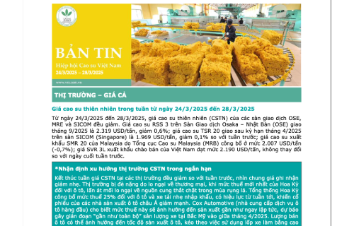 Từ ngày 19/5/2025 đến 23/5/2025, giá cao su thiên nhiên (CSTN) của các sàn giao dịch OSE, MRE và SICOM biến động trái chiều nhau. Giá cao su RSS 3 trên Sàn Giao dịch Osaka – Nhật Bản (OSE) giao tháng 10/2025 là 2.240 USD/tấn, tăng 3,8%; giá cao su TSR 20 giao sau kỳ hạn tháng 5/2025 trên sàn SICOM (Singapore) là 1.695 USD/tấn.